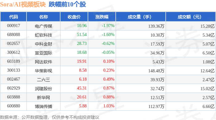 Sora/AI视频板块个股资金流向见下表:以上内容为证券之星据息拾掇,逛资资金净流入9262.11万元,由AI算法生成(网信算备240019号),查看更多