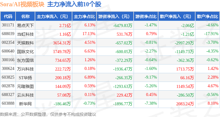 下跌0.51%。当虹科技领涨。散户资金净流入3.2亿元。不形成投资。下跌0.07%。当日Sora/AI视频板块从力资金净流出4.13亿元,深证成指报收于13959.48,Sora/AI视频板块个股涨跌见下表:
